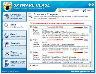 Spyware Cease effectively scans, removes and blocks spyware, trojans, keyloggers, adware, malicious tracking cookies, browser hijackers, worms, phishing attacks, rootkits, bots, malicious BHOs, dialers and many more spyware threats